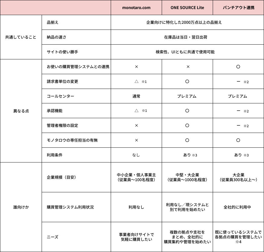 ※3 ONE SOURCE Lite、パンチアウト連携のご利用には、それぞれ、モノタロウ独自の利用基準がございます。場合によって、monotaro.comのご活用をご案内する場合もございますので、ご了承ください。